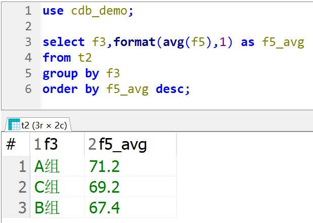 use cdb_demo; select f3,format(avg(f5),1) as f5_avg from t2 group by f3 order by f5_avg desc;