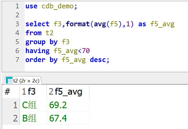 use cdb_demo; select f3,format(avg(f5),1) as f5_avg from t2 group by f3 having f5_avg<70 order by f5_avg desc;