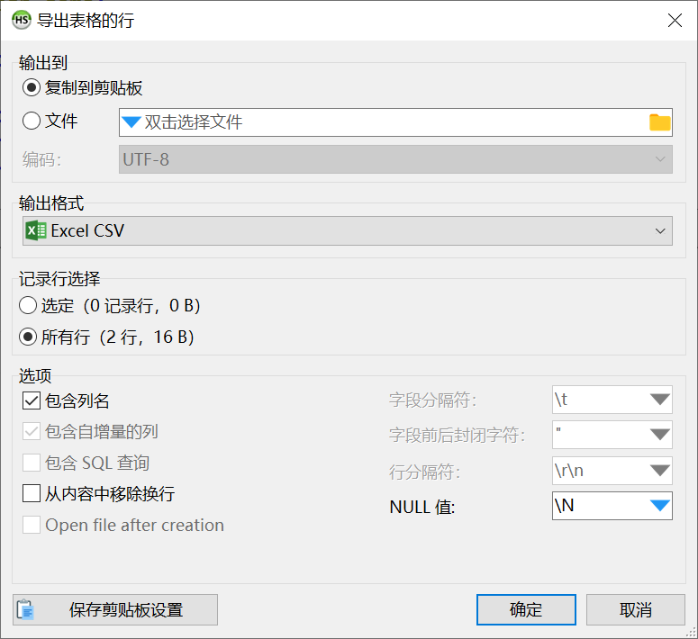 在HeidiSQL中,可以将查询结果很方便的保存到Excel工作表中。查询执行完成后,可以通过HeidiSQL菜单“工具”>>“导出表格的行”项打开导出窗口,如下图所示。