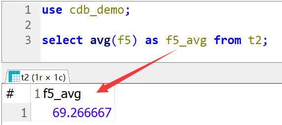 本例使用avg(f5)计算f5字段的平均数,然后使用as关键字定义计算结果的列名为f5_avg。