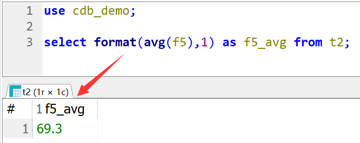 use cdb_demo; select format(avg(f5),1) as f5_avg from t2;