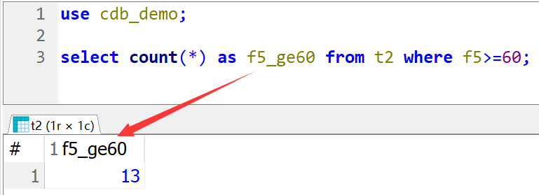 use cdb_demo; select count(*) as f5_ge60 from t2 where f5>=60;