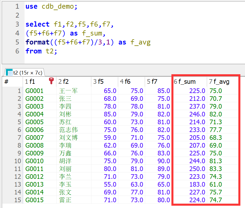 use cdb_demo; select f1,f2,f5,f6,f7, (f5+f6+f7) as f_sum, format((f5+f6+f7)/3,1) as f_avg from t2;