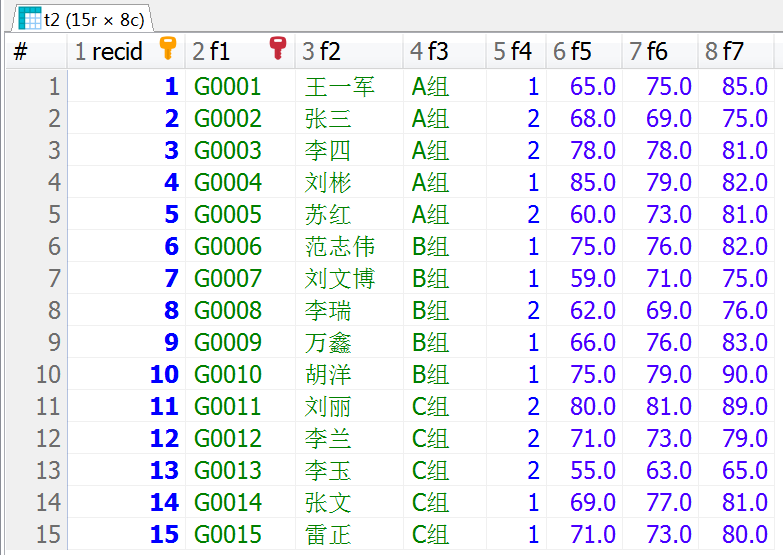 在<查询文本>中,可以使用下画线(_)表示一个字符,使用百分号(%)表示零个或多个字符。接下来的示例使用t2表的数据进行演示,其原始数据如下图所示。