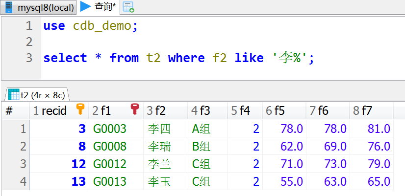 use cdb_demo; select * from t2 where f2 like '李%';