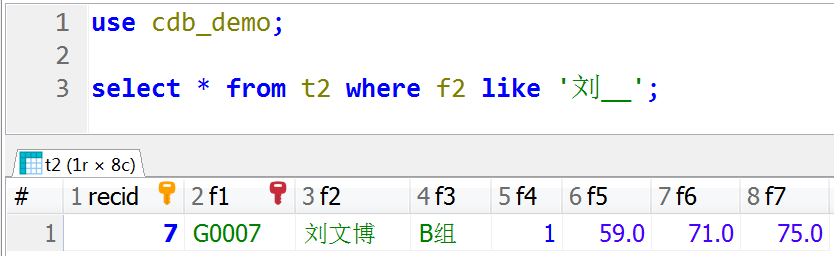 use cdb_demo; select * from t2 where f2 like '刘__';