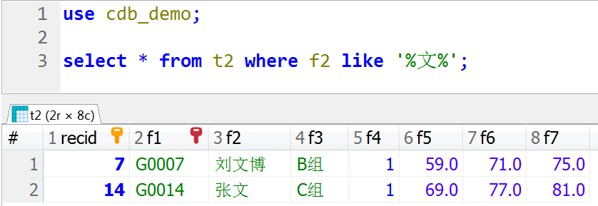 use cdb_demo; select * from t2 where f2 like '%文%';