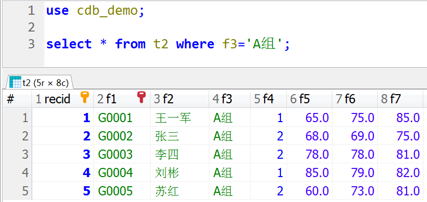 use cdb_demo; select * from t2 where f3='A组';