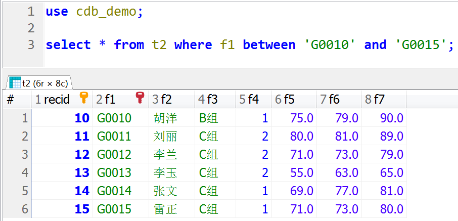 use cdb_demo; select * from t2 where f1 between 'G0010' and 'G0015';