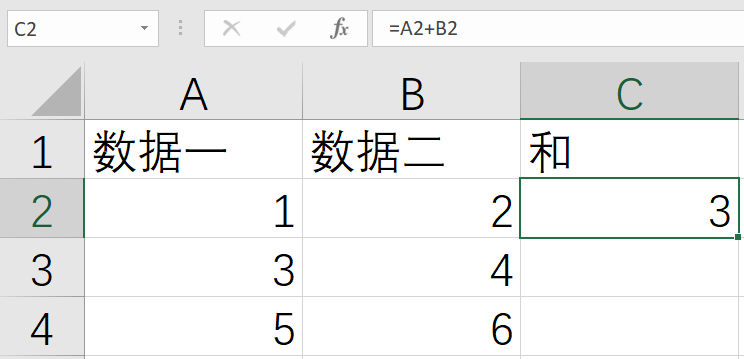 接下来需要在C列中显示每行中数据一和数据二相加的和。首先选中C2单元格,输入公式“=A2+B2”并回车(ENTER)确认,此时C2单元格会显示计算结果3,如下图所示。