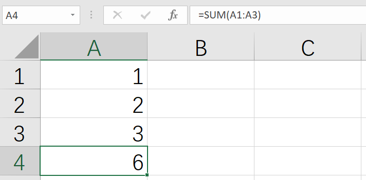 在单元格中调用函数有一些基本方式。第一种方法是在单元格中直接输入,如下图所示,在A1单元格中有数字1,A2单元格中有数字2,A3单元格中有数字3,在A4单元格中输入“=SUM(A1:A3)”并按回车(Enter)键确认,此时A4单元格会显示A1到A3单元格数据相加的和,如下图。